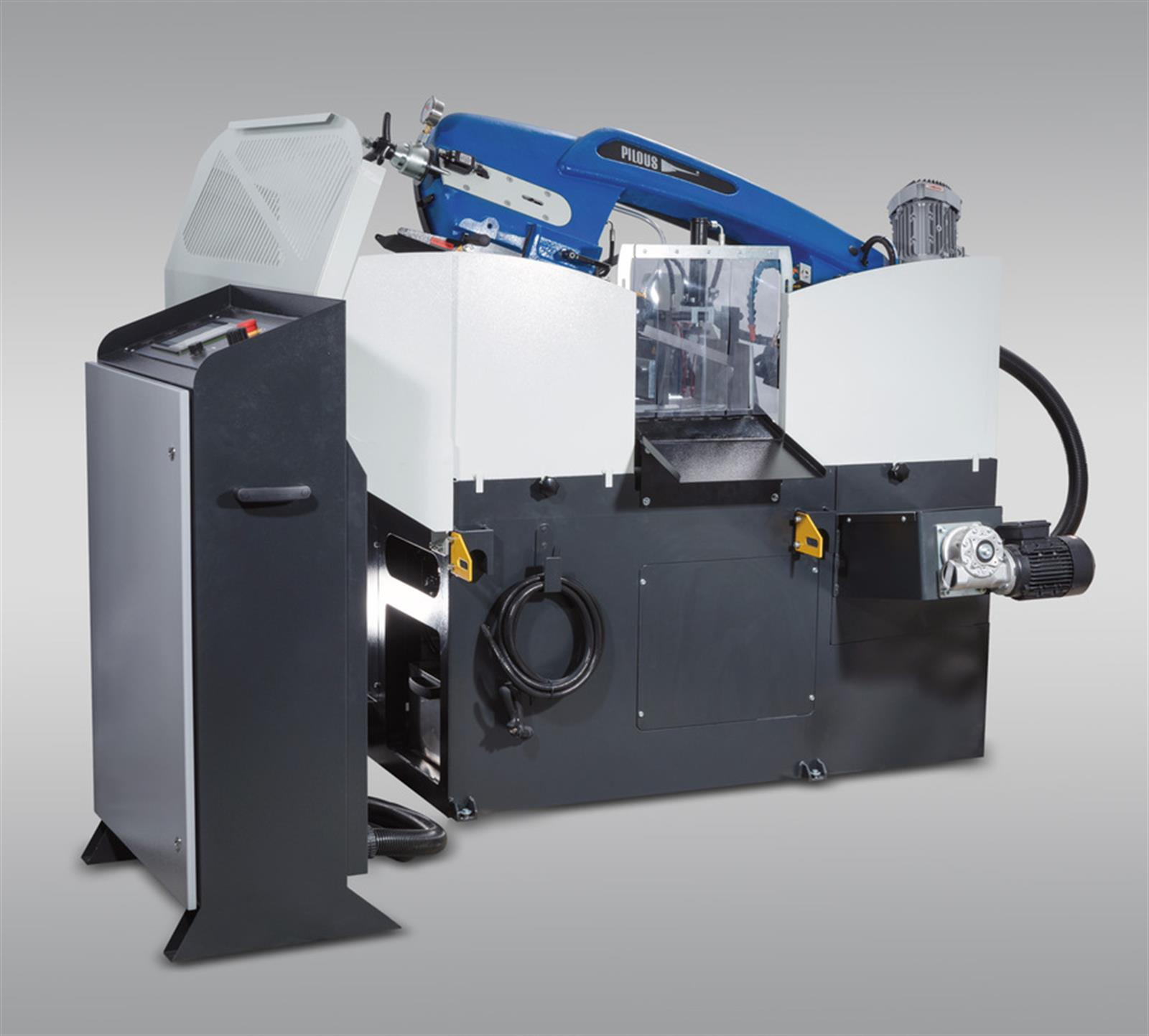Apart from creating an entirely new design of the arm, we also made many technical adjustments and changes improving the quality, user comfort and service life of the machine. As an accessory, it is possible to use the cleaning brush of the saw band that is synchronously driven by the driving wheel. Simple intuitive control using ergonomically positioned controls on a separate central control panel. The very robust machine framework composed of grey iron castings guarantees safe vibration absorption. The modern concept of the band saw arm allows large cutting ranges in perpendicular as well as angular cuts. Optimal-diameter running wheels and precise three-side hardened steel blade guides ensure long service life of the band and cutting accuracy. The optimal fit of the running wheels, the tensioning system and all rotating parts increases the service life of the machine. Noiseless and maintenance-free drive of the saw band is provided by an industrial electric motor with a worm gearbox. Check of the correct tension or tear of the saw band. When the saw band breaks, the machine automatically stops. The machine is connected to a complete cooling system with a powerful pump, enabling separate flow control on both guide heads and another adjustable outlet. The emulsion tank with a powerful pump is located in the machine base.
